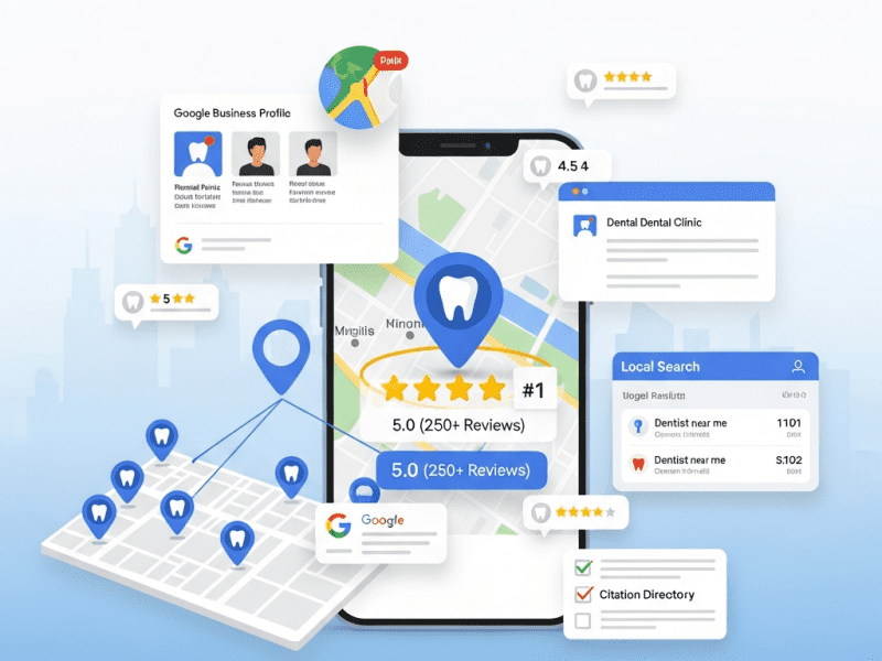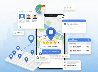 Challenge: SparkSmile Dental Group’s 5 Chennai clinics were invisible in local search — zero presence in Google’s Local 3-Pack, only 124 reviews at 3.8 stars, NAP inconsistencies across 47 directories, no location-specific web pages, no GBP content strategy, and just 44 appointment bookings monthly from Google. Competitors with 680+ reviews and optimized profiles were capturing all the local search patients.