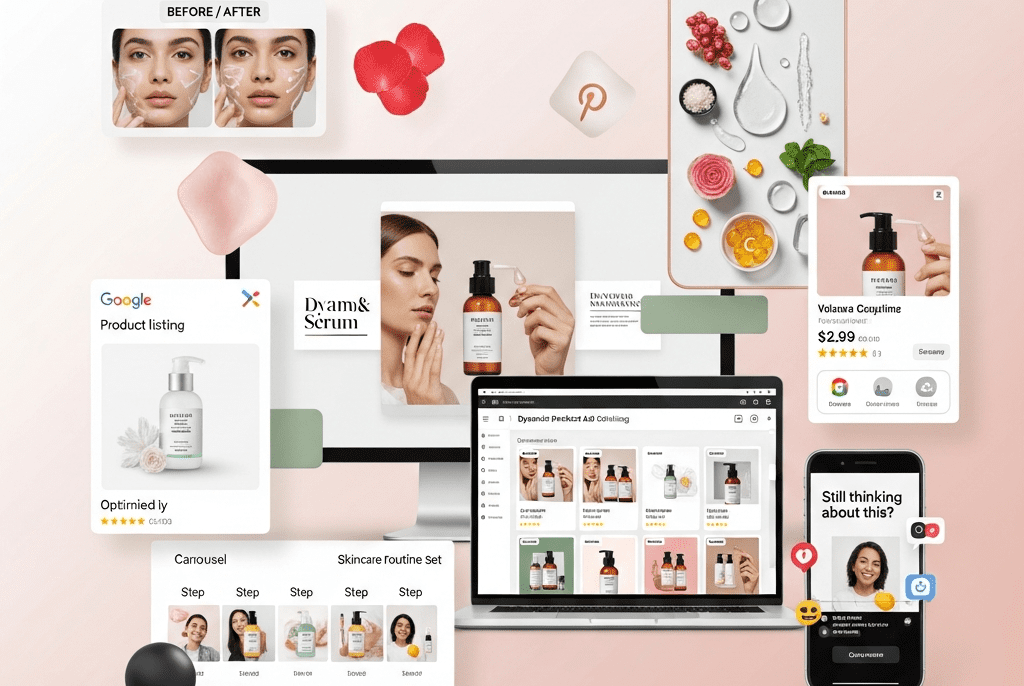 We built a complete product and e-commerce ad creative system for LunaGlow Beauty — producing 160+ conversion-optimized ad creatives across Meta, TikTok, Pinterest, and Google Shopping, increasing ROAS from 2.1x to 7.4x, lifting product page conversion by 68%, and transforming generic product photos into scroll-stopping, purchase-driving visual commerce.