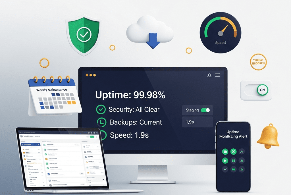 Services DeliveredWordPress Core, Plugin & Theme Updates, Security Monitoring & Hardening, Uptime Monitoring & Incident Response, Daily Automated Backups & Disaster Recovery, Performance Monitoring & Speed Maintenance, Content Updates & Minor Edits, Staging Environment Management, Monthly Health Reports, Emergency Support & Priority Response, Compliance & Accessibility Maintenance, Strategic Quarterly Reviews